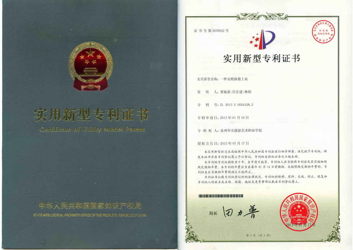 《安眠保健上衣》授权专利号:ZL201320024128.2;专利证书号第3039922号。