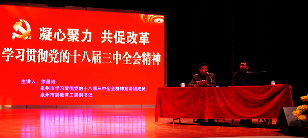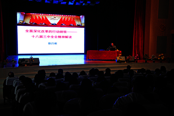 12月31日下午,市学习贯彻党的十八届三中全会精神宣讲团成员、市教工委副书记徐昌裕同志莅临我校,在吴文季音乐厅举行学习党的十八届三中全会精神专题辅导报告。我校全体教职工和部分学生代表听取了报告。报告会由党委周文林副书记主持。