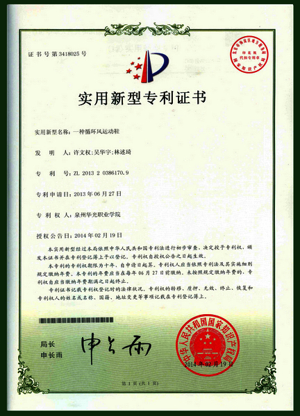 鞋服学院11级鞋类设计与工艺2班学生许文权同学设计发明的《循环风运动鞋》,于2014年2月19日被国家知识产权局授权为实用新型专利,证书号第3418025号,专利号:ZL201320386170.9。