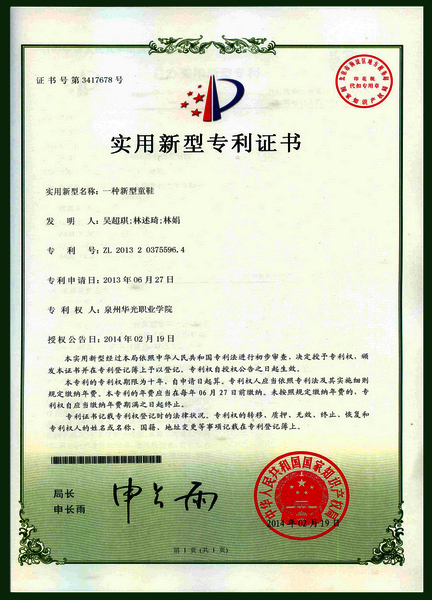 鞋服学院11级鞋类设计与工艺1班学生吴超琪同学设计发明的《新型童鞋》,于2014年2月19日被国家知识产权局授权为实用新型专利,证书号第3417678号,专利号:ZL201320375596.4。