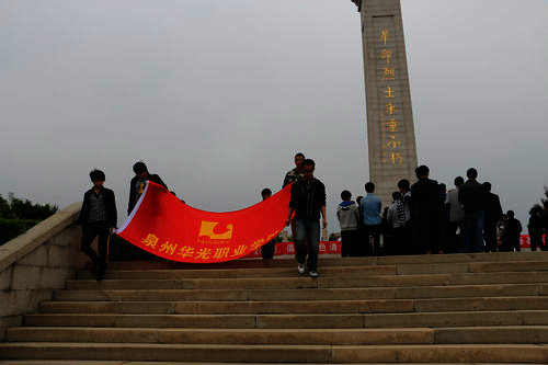 随后,四位同学抬着大大的花圈敬献给革命先烈们。花圈从右到左上写着两句挽联:“革命烈士永垂不朽泉州华光职业学院敬献”。全体代表则有序地绕着纪念碑敬献小白花、瞻仰先烈。最后全体人员在周书记的带领下,参观了烈士纪念馆。在参观过程中,大家神情严肃,在听到一个个革命先烈壮烈事迹、看到一张张历史资料和图片时,由衷对革命先烈的尊敬和怀念。