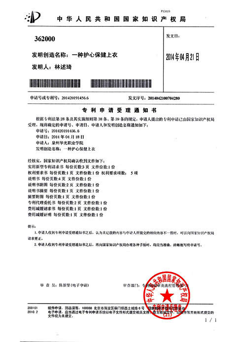 由泉州华光职业学院提出的“护心保健上衣”实用新型专利申请,经国家知识产权局核实,确定申请号:201420191456.6;发明创造名称:一种护心保健上衣。