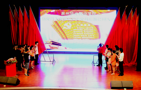 6月6日,泉州华光职业学院在吴文季音乐厅隆重举行了新党员入党宣誓暨老党员重温誓词大会,出席宣誓仪式有党委副书记周文林、副书记、副院长吴华宇,各支部委员、团委书记和79名新党员以及部分老党员。宣誓仪式由党办主任邢丽珍主持。