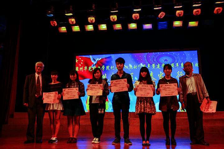 表彰、宣誓仪式由团委黄冬梅书记主持,大会共分为五项议程项。表彰大会在雄壮的国歌声拉开帷幕,随后党委周文林副书记发表热情洋溢的讲话,他列述了学校共青团在纪念五四运动期间开展的系列学习活动及取得的显著成效,并对广大团员、青年提出了殷切的希望。随后会议进入第三项议程,对获得市、校五四评优的集体及个人进行颁奖,其中我校建工学院团总支荣获“2014年度泉州市五四红旗团(总)支部”称号、摄影学院团总支副书记叶兴文同学获得“2014年度泉州市优秀共青团员”称号;14级人像摄影团支部等9个团支部获得“2014年度泉州华光职业学院五四团支部”称号、何玉凤等117名同学获得“2014年度泉州华光职业学院优秀共青团员”称号、林沄坚等43名同学获得“2014年度泉州华光职业学院优秀共青团干部”称号。紧随其后进入第四项议程,新团员入团宣誓老团员重温誓词仪式。在宣誓仪式上,新老团员们通过宣誓进一步增强了团员的责任感和荣誉感,也让我们看到团员青年为泉州开启“21世纪海上丝绸之路先行区”建设、为加快我校科学发展跨越发展的工作目标而直起奋斗的决心。