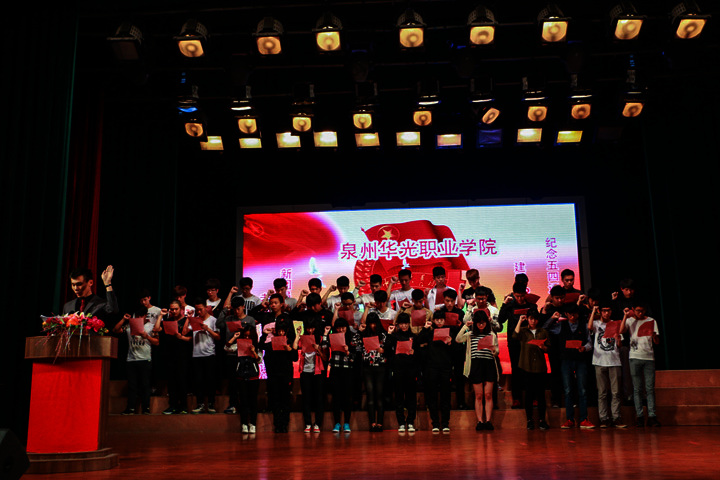 在全团深入贯彻十八大和十八届四中全会精神、深入学习习近平总书记系列重要讲话精神,进一步培育和践行社会主义核心价值观,深入开展发扬和继承五四精神的学习实践活动之际,5月6日下午,“海丝先行区,青年当先行“泉州华光职业学院纪念五四运动96周年暨建团93周年系列活动之表彰、宣誓暨合唱比赛在吴文季音乐厅举行。学院董事长吴其萃,党委副书记周文林、副书记副院长吴华宇、副院长林鸿海、院务督导卢天生、党办主任邢丽珍、后勤处处长许志文、学生处副处长团委副书记陈雄,各党支部书记、委员及各处室老师参加了大会。