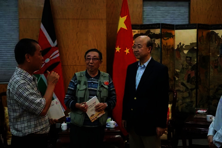 下午五点,在刘总一行陪同下,抵中国驻肯尼亚大使馆,拜访了刘大使。受到大使热情接待。杨院长向大使先生祥细介绍了三十年前重走海丝路的经历,引起大使极大兴趣。吴董事长将本次重走海丝路的构想征求了大使的意见,得到了大使的充分肯定,並表示将协调国内外机构部门全面配合实施。向大使先生贈送了海丝特刊、光盘及家乡铁观音、旗袍酒等。大使先生送给了我们一套肯尼亚丛书作为纪念。