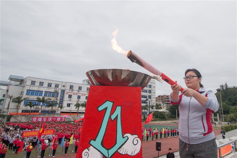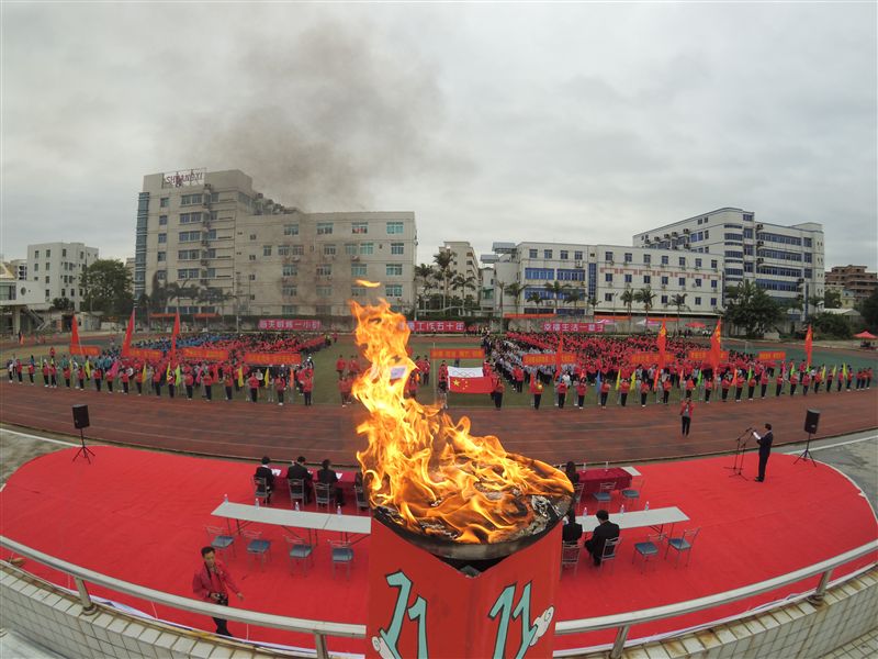 在各方阵进场后,火炬传递仪式成了现场的焦点。第一棒火炬手为14级人像摄影的林嘉鑫同学,他在第十届校运会上以12.70米的成绩打破了男子铅球纪录,两名护跑者紧跟其后,第二棒火炬手黄晶晶,在去年的运动会上,她以5分58秒的成绩荣获女子1500米第一名。火炬围绕操场行进一圈后,火炬手跑到国旗台前点燃了圣火,熊熊燃起的火焰预示着我校的蓬勃发展。