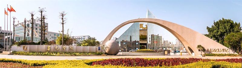 作为一所大学的门面,校门是精神的象征:渐变的飞虹,勾住巨大的圆球,宛如一个“象鼻”在表演着魔术。身后的主楼,以三角作为主造型,抛物体的立面,银灰镀膜幕墙,映衬着二十四小时的天光月色,三百六十五天的车水马龙,构成了一幅升平盛世的万花筒。校门与主楼一起构成“H”“G”的符号,就是“华光”的意思。