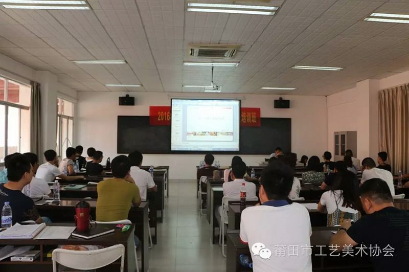 莆田市工艺美术协会组织的2016年工艺美术系列中初级职称课程培训班于近期在黄石工艺城展示中心三层大专班教室正式开班。泉州华光职业学院艺术设计学院范楠楠副院长、招生办黄佛保副主任、陈旭讲师到场授课。本期中初级职称培训班共64名学员参加三门课程进修培训。
