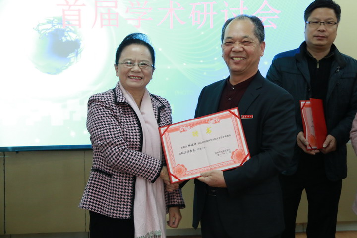 在第一届学术委员会受聘仪式上,陈雅芳校长为学术委员会委员颁发聘书。林副校长作2016年学术科研工作总结与2017年工作计划报告。