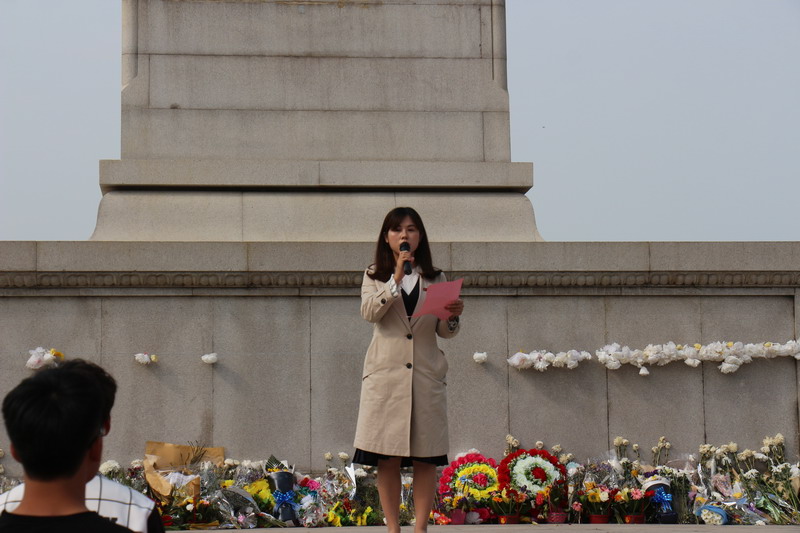 党办主任郑桂梅发表讲话,希望党员干部、团员青年铭记英雄先烈的事迹,弘扬英雄先烈的精神,继承英雄先烈的遗志,努力学习,不断提高自身素质,为学校和社会的发展做出贡献。之后,全体代表有序地绕着纪念碑瞻仰先烈。