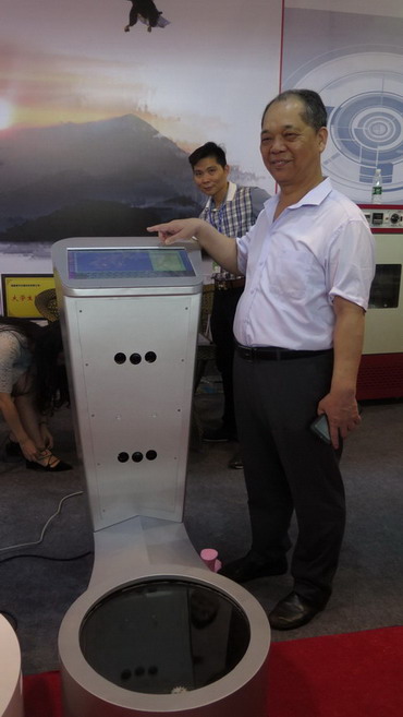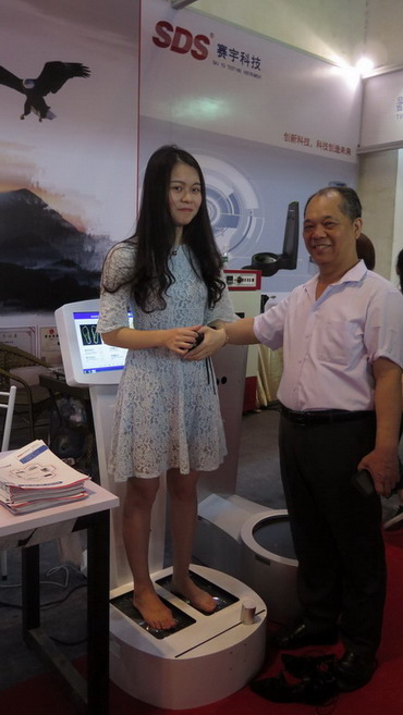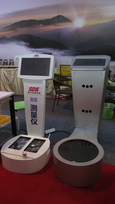 4月19日在第十九届中国(晋江)国际鞋业暨第二届国际体育产业博览会科技展示厅,华光学院鞋服科学研究所林所长与福建赛宇仪器科技有限公司陈总经理,对校企共同研发的“2D脚型测量仪”和“3D脚型测量仪”进行调试分析示范。“脚型测量仪”系列产品亮相鞋博会,引起业界的极大关注。