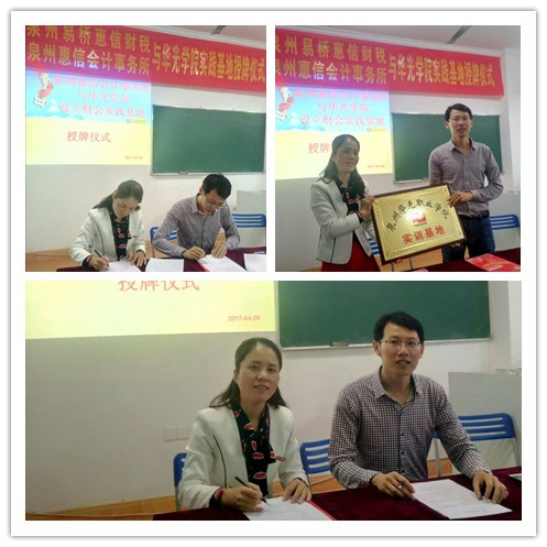 4月26日下午,商学院副院长叶丹与与泉州惠信会计事务所洽谈合作事宜,并签订校外实训基地协议。今后,该事务所将为泉州华光职业学院商学院的会计、财务管理专业学生提供见习实习场地以及就业机会。近年来,我校商学院积极开展校企合作,已与二十多家优质企业建立校企合作关系。校企共建实习实训基地极大地推进学校的专业建设以及人才培养质量,也促进企业选拔优秀人才,达到双赢的目的。