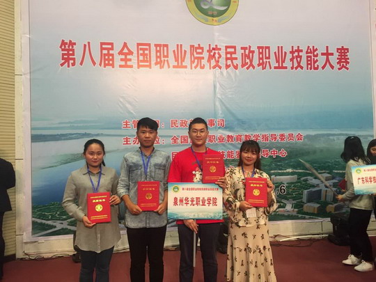近日,由民政部人事司主管,全国民政职业教育教学指导委员会、民政部职业技能鉴定指导中心主办,三门峡职业技术学院承办的第八届全国职业院校民政职业技能大赛在河南三门峡举办。我校中婚旅游产业学院杨润函同学获得礼仪主持人一等奖,李鑫、吴静、宋郑鑫同学获礼仪主持人三等奖。马颖老师获优秀指导教师奖,泉州华光职业学院获优秀组织奖。