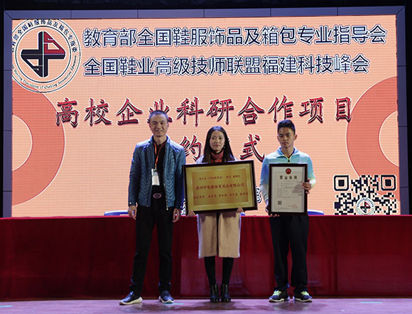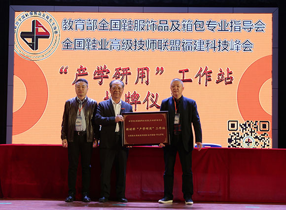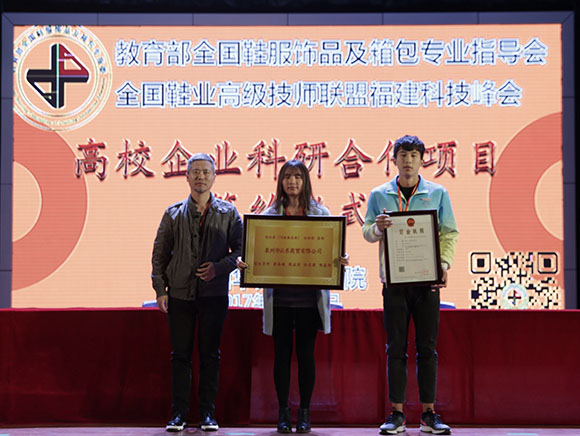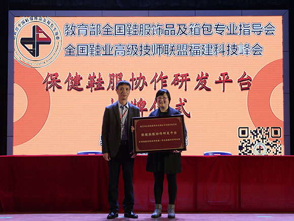 全国鞋业高级技师联盟福建分会柯育发监事长为《保健鞋服协作研发平台》授牌。