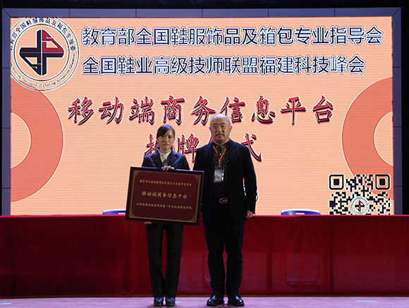 全国鞋业高级技师联盟福建分会熊益清常务副会长为《移动端商务信息平台》授牌。
