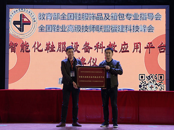 泉州市纺织服装商会林国强秘书长为《智能化鞋服设备科教应用平台》授牌。