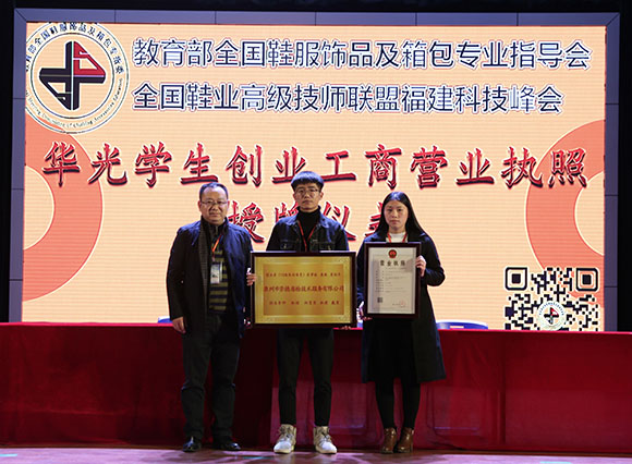 全国鞋业高级技师联盟福建分会谢华伟副秘书长作为创业导师为学生创业授工商营业执照《泉州市云系商贸有限公司》牌。