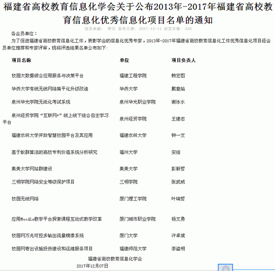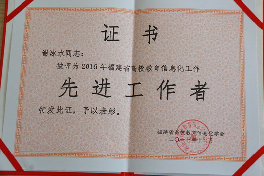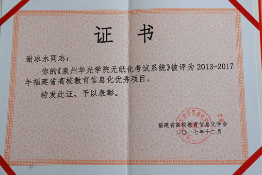 近日,福建省高校教育信息化学会公布2013年-2017年福建省高校教育信息化优秀信息化项目名单,我校谢冰水老师的《泉州华光职业学院无纸化考试系统》被评为优秀项目。同时,谢冰水老师还被评为2016年福建省高校教育信息化工作先进工作者。