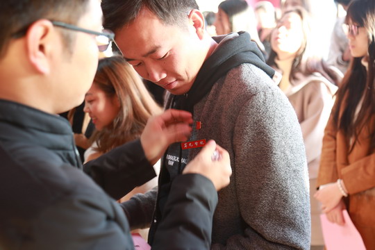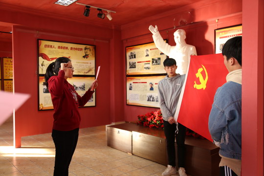 仪式上,新党员面向鲜红的党旗,右手握拳举过肩头,在领誓人林是非的逐句领读下庄严宣誓。他们用清脆响亮的声音、铿锵有力的誓词表达了对党忠诚、为共产主义事业奋斗终身的决心。宣誓完毕,老党员为新党员佩戴党徽,艺术设计学院李鹤鸣同学代表新党员发言。