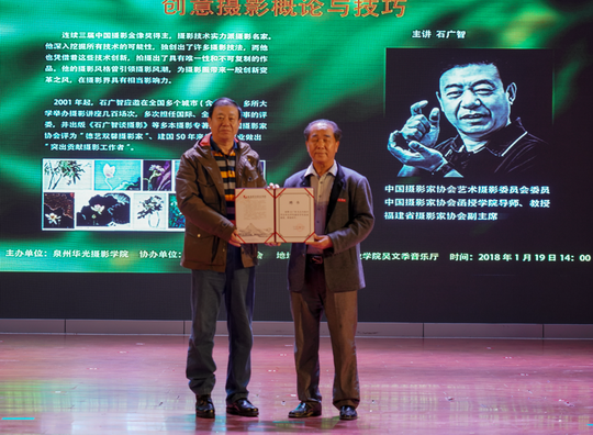 我校董事长吴其萃向泉州市摄影家协会的影友们及我校摄影学院的学生介绍石广智老师,并为其颁发泉州华光职业学院客座教授聘书。