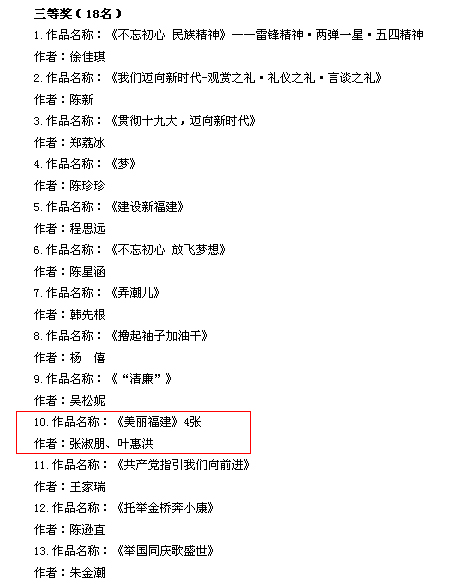 近日,由中共福建省委宣传部会同中共福建省委教育工委、福建省文学艺术界联合会开展的关于“学习贯彻十九大精神·我们迈向新时代”主题征集评选活动结果公布,我校艺术设计学院张淑朋老师和15级广告1班叶惠洪共同设计的作品《美丽福建》(4幅),获平面公益广告类三等奖。