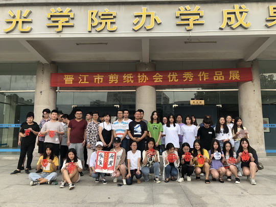 在我校教学楼一楼展厅,晋江剪纸协会的优秀作品展也同时开幕,杨老师向同学们展示了他们的作品,指导学生如何在传统剪纸上创新。杨老师与同学们展开现场互动,亲手做示范,她娴熟的技法,精湛的剪纸技艺,让栩栩如生的人物形象、花团锦簇的吉祥图案不一会儿就跃然纸上,赢得了现场同学的啧啧称奇。同学们跃跃欲试,也都拿起剪刀在老师的指导下,小心翼翼地用剪刀裁剪出脸谱,在剪纸中体验剪纸艺术带给我们的乐趣。