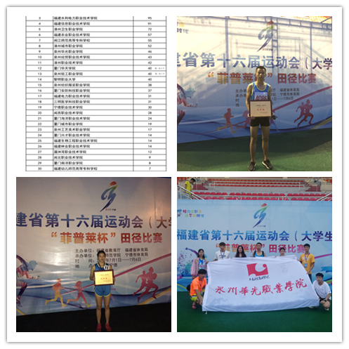 三个丙组第一、团体三等奖,我校在福建省第十六届大学生运动会田径比赛中成绩傲人,成民办高职学校团体成绩最佳院校。