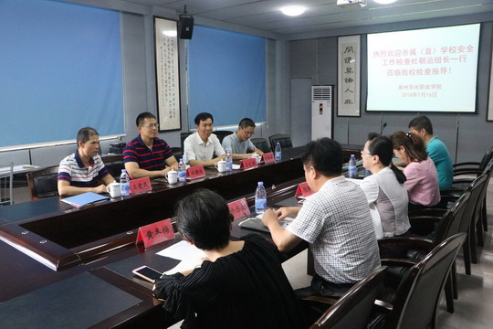 7月16日下午,根据《泉州市教育局关于开展2018年学校安全工作半年考评暨交叉检查的通知》泉教安〔2018〕35号文件精神,市属(直)学校安全工作检查组杜朝运组长一行莅临我校进行检查,我校校长陈雅芳、党办主任郑桂梅、后勤处处长许志文、学生处处长黄冬梅、保卫处副处长郑金柄等参加检查。