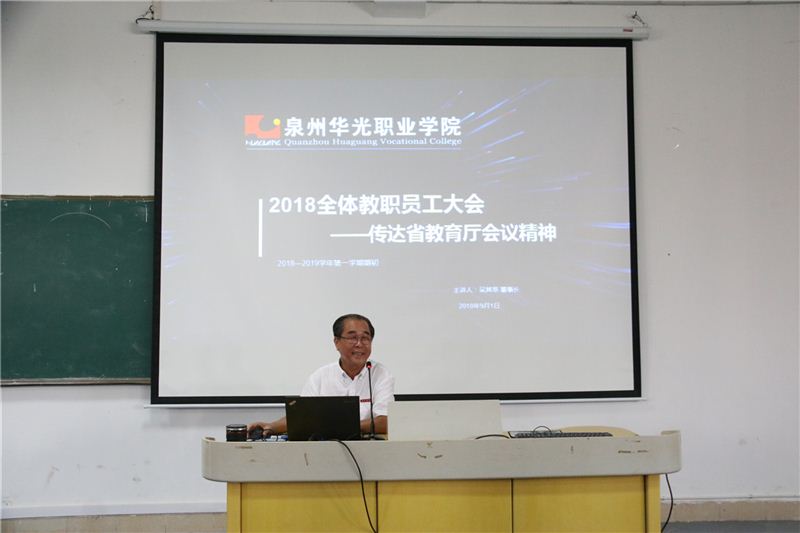 9月1日上午,我校在教学楼A307召开2018-2019学年第一学期全体教职工大会,我校董事长吴其萃、校领导以及全体教职员工参加会议。大会学习了省教育厅关于高等教育的会议精神,并围绕学校升本的目标,提出2018-2019学年工作思路,部署新学期主要工作,动员全体华光人同心同德,尽心尽力,为实现理想和目标奋斗不止。