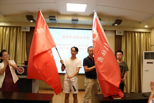 许元洪老师汇报本次思政课实践教学活动暨青马工程社会实践前期筹备工作及活动安排等情况。陈雅芳校长、陈雄华副书记共同为社会实践学生代表授旗。