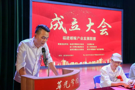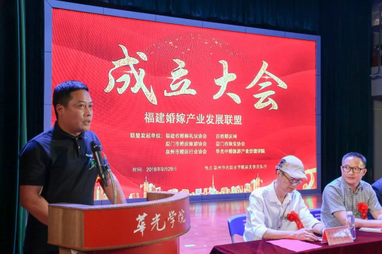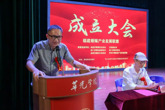 福建省婚嫁产业发展联盟首届联盟委员会主席、泉州华光职业学院董事长吴其萃上台致辞。吴董事长表示该联盟的成立旨在整合福建省内婚庆产业链资源,搭建婚庆产业主体间互动交流、团结向上、共赢发展的产业资源共享的服务平台;同时促进相关主体之间的交流和深度合作和供需对接、人才培养与社会、婚嫁产业与市场需求的有效对接,协调解决行业内存在的问题。是启动人才培养工程,执行中国商业联合会婚庆委员会行业人才培养方案,加强行业人才队伍建设,促进各主体间的优势互补、资源共享、福建省婚庆产业健康发展的有效途径。