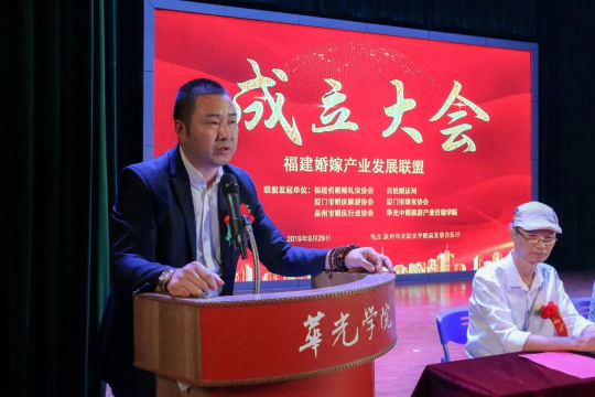 江苏省婚庆行业协会会长、婚庆行业委员会副主任常真发言,他代表江苏省婚庆协会对福建省婚嫁产业发展联盟的成立表示祝贺。