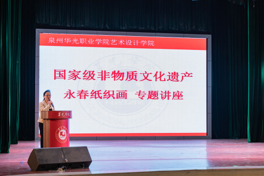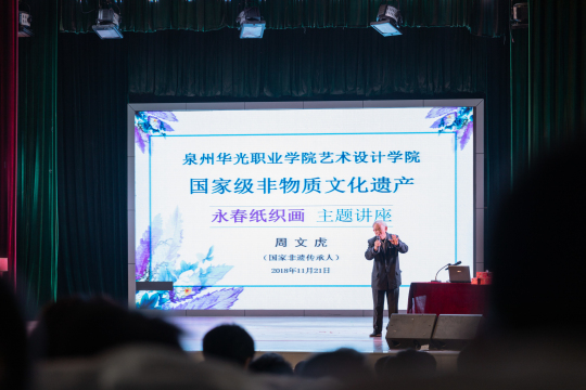 为了更好的传承中华民族优秀传统文化,弘扬工匠精神,11月21日下午,我校艺术设计学院特邀请国家级非遗传承人周文虎老师和永春文化馆周梁泉馆长来校举办“永春纸织画”专题讲座,为我校艺术设计学院学生传授永春纸织画的技艺。我校校长陈雅芳,副校长徐颖惠、吴华轩以及各职能部门的老师也到场听讲。