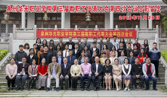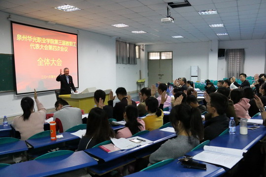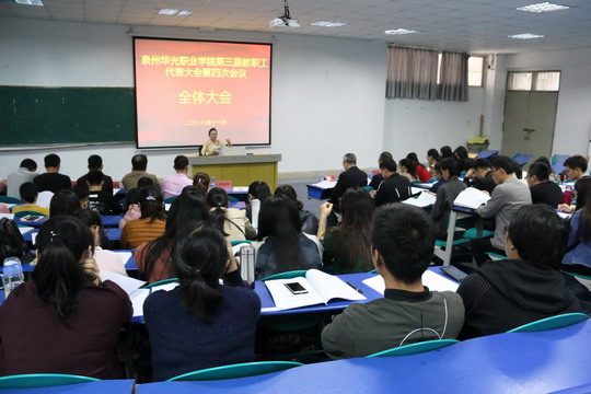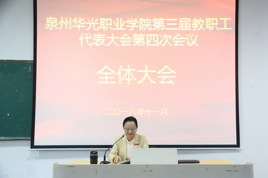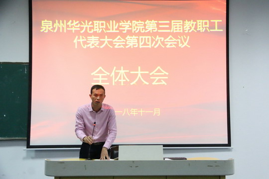 11月28日下午,泉州华光职业学院第三届教职工代表大会第四次会议在A307隆重召开,大会以“凝心聚力跨越发展 出谋献策推动升本”为主题,63名教职工代表以主人翁的态度认真审议大会各项议程,为学校的发展建言献策,会议由我校副校长徐颖惠主持。