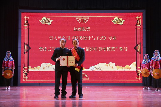 会上吴董事长为2018年“福建省劳动模范”获得者、贵人鸟股份有限公司二元制“鞋类设计与工艺”大专班樊凌云同学授红绶带。