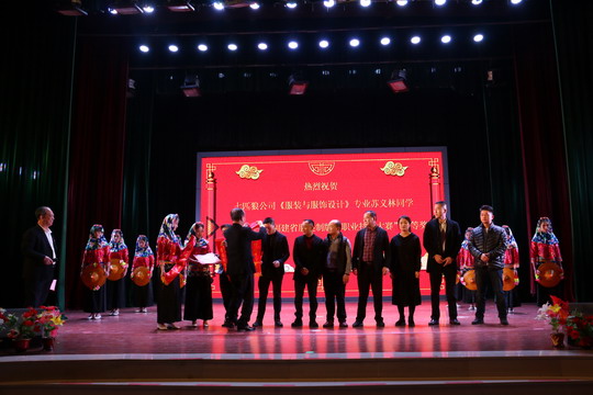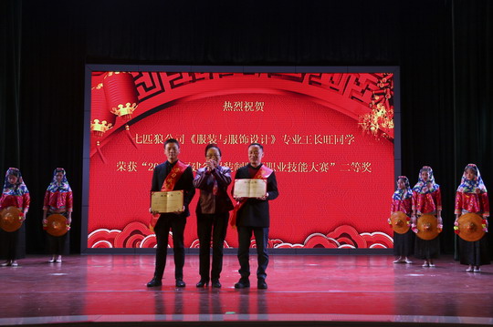 陈雅芳校长为“2018年福建省服装制版师职业技能大赛”一等奖获得者、七匹狼有限公司二元制“服装与服饰设计”专业大专班苏义林同学和“2018年福建省服装制版师职业技能大赛”二等奖获得者、七匹狼有限公司二元制“服装与服饰设计”专业大专班王长旺同学授红绶带。