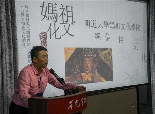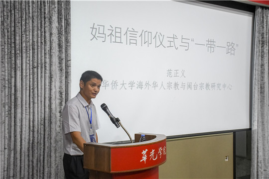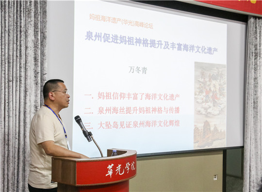 论坛在歌曲《妈祖颂》的悠扬声中拉开帷幕,论坛上,与会嘉宾怀揣愿景,各抒其志,致力将妈祖的博爱、扶弱济贫、勇敢无畏、不屈不挠的精神发扬光大;为促进海峡两岸同根同源的文化交流奉献力量;为“一带一路”经济线的繁荣发展添砖加瓦。海丝妈祖文化研究所所长林少川作“弘扬妈祖文化,助力一带一路”主旨演讲;华侨大学哲学与社会发展学院范正义教授提出:妈祖信仰仪式有助于广泛联系海外华人,使他们在中国与海丝沿线国家的友好交流中发挥桥头堡的作用;泉州府文庙文物保护管理处主任何振良强调应充分发挥妈祖文化在“一带一路”建设中的文化功能;福建省收藏家协会副会长万冬青向来宾介绍丰富的泉州海洋文化遗产和遍布20多个国家和地区的妈祖信仰;著名导演张鑫和资深影视制片人张万一在论坛上宣布电影《海上女神——妈祖》的拍摄正式启动,希望用艺术的魅力,让妈祖大爱的精神感染更多人;我校董事长吴其萃在会上表示,华光学院在继承和发扬中华优秀传统方面一直有自己的担当和作为,之前,我校成立华夏非物质文化遗产研究院,下设海丝妈祖文化研究所等机构,力求以一所高职院校的力量担当起研究传承和发扬的重任,为地区发展和人民幸福贡献力量。