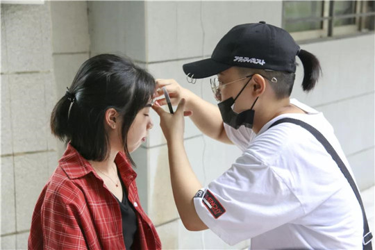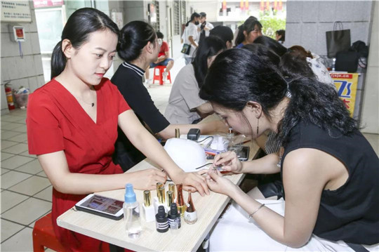 同日,摄影学院人物形象设计班在许艳清老师的指导下,拿起工具,摆起摊子,现场为师生开展修眉、化妆、美甲等服务,既展示了专业所学,也服务了广大师生,为职教周添上一道亮丽的风景。