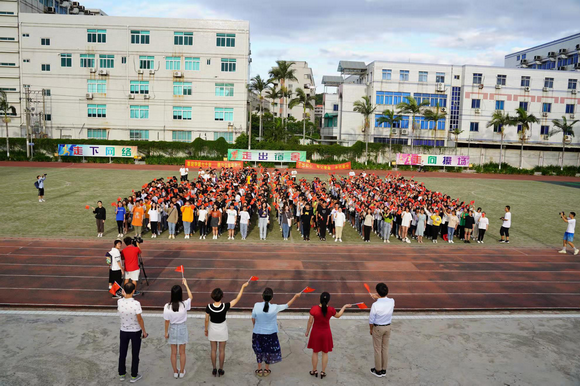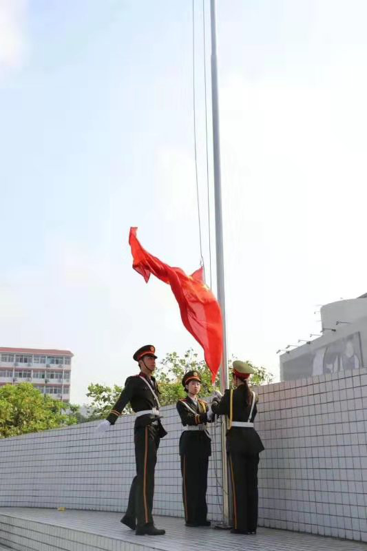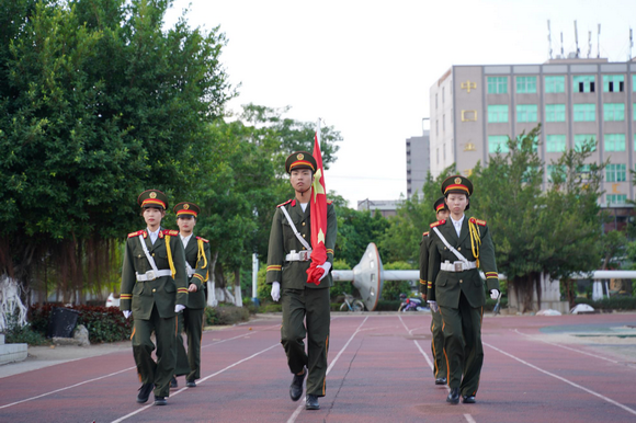 7时整,晨曦破晓,升旗仪式正式开始,全体师生整齐列队,庄严肃立于田径场,国旗护卫队的同学们迈着矫健的步伐护送五星红旗昂首走过主席台。