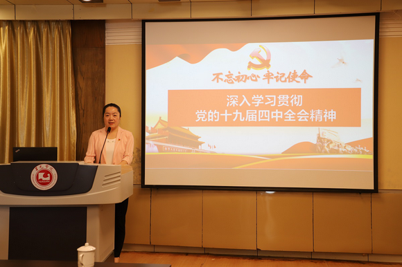 11月12日上午,我校党委面向全体党员干部召开专题会议传达学习贯彻党的十九届四中全会精神。会上,党委书记吴颖芳传达了习近平总书记代表中共中央政治局所作的工作报告要点以及《中共中央关于坚持和完善中国特色社会主义制度、推进国家治理体系和治理能力现代化若干重大问题的决定》的主要精神,并部署学校学习贯彻工作。