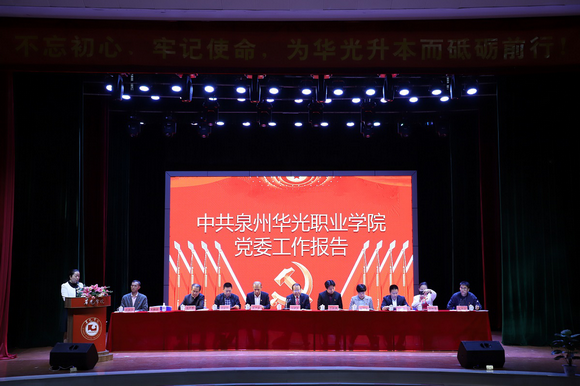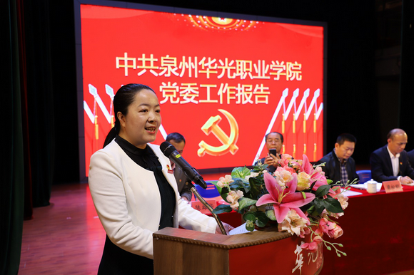 吴颖芳书记代表中共泉州华光职业学院第一届委员会向大会作题为《不忘初心、牢记使命,为华光升本而砥砺前行!》的报告。报告分为“回顾既往,全面加强党的建设”、“分析存在的问题”、“展望未来,奋力开创学校党建工作新篇章”三个部分。