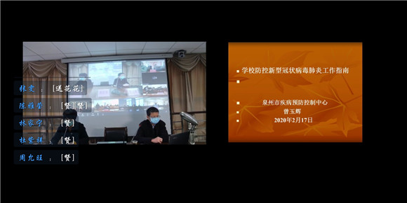 为进一步推进全市各级各类学校做好返学前后新冠肺炎疫情防控工作,2月17日下午,泉州市教育系统防控新型冠状病毒感染的肺炎疫情工作领导小组通过视频组织全市教育系统疫情防控工作培训,我校党委书记吴颖芳,后勤处处长许志文、人事处副处长杨小云、学生处副处长黄强、后勤处副处长郑金柄以及校医刘君君在我校行政楼第二会议室听取视频讲座和会议,全体校领导、中层干部通过手机端参加视频会议,会议主要听取了泉州市疾控中心消杀科科长、副主任医师曾玉辉作《学校防控新型冠状病毒肺炎工作指南》专题讲座和市委教育工委书记、市教育局局长黄世界关于疫情防控工作的重要讲话。