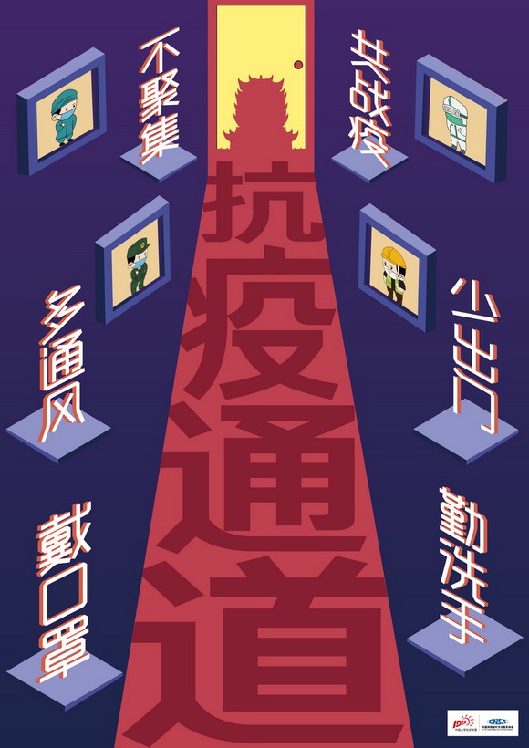 设计说明:该海报结合一条通往武汉抗疫通道,通道两侧墙上写了"戴口罩,勤洗手,多通风,少出门,不聚餐,共战疫"提醒大家在疫情期间做好防护工作,共同战疫,四个Q版手动比赞的一线人员,表达了对于疫情期间前往武汉支援的人们的赞美,也体现了一线人员不惧艰险甘于奉献的精神。
