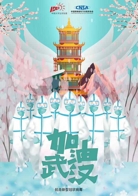 设计说明:海报以湖北武汉的黄鹤楼为主体,有来自四面八方来的前线抗疫英雄驰援武汉帮助抗击新型冠状病毒,帮助武汉进行防守保卫工作,相信他们会让武汉迎来春暖花开,自由飞翔,会等你们平安回来,武汉加油 !
