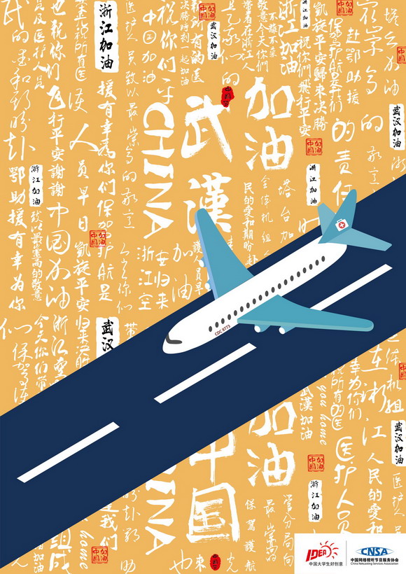设计说明:海报的设计灵感来源于一架运送物资与医护人员的飞机飞行员与浙江空管分局的一段对话。海报主体为飞机与跑道,飞机的机尾我加入了理疗箱,代表救援物资,飞机旁边我加入了飞机编码,飞机底纹的字体为对话内容,在海报中我加入了中国的印章。