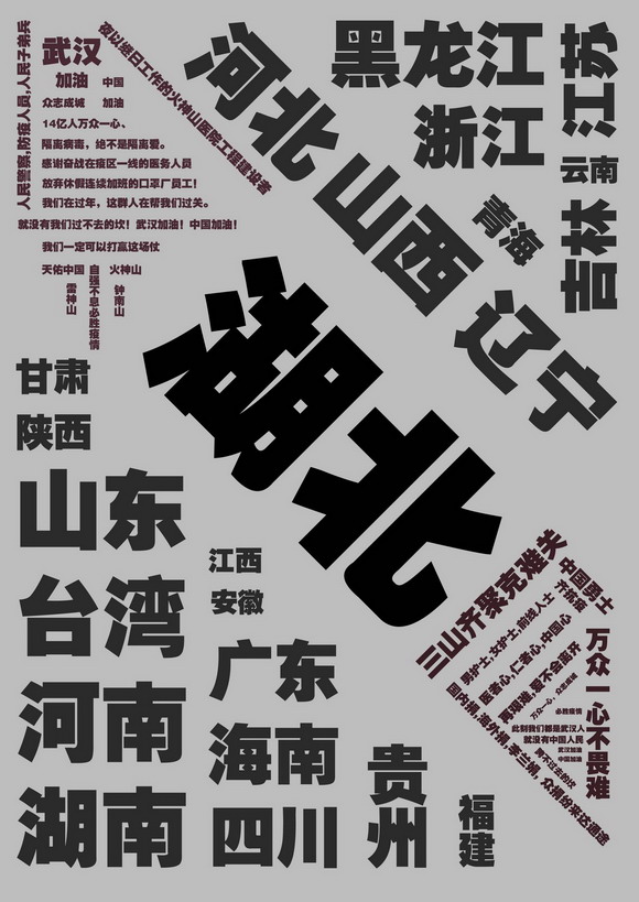 设计说明:各个省份串通起来表明举国上下,支援湖北,同心抗疫:每个人对湖北的加油呐喊声,湖北加油!武汉加油!