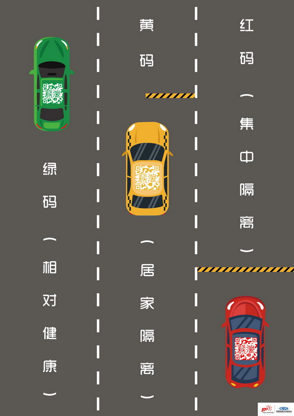 设计说明:海报的设计灵感来源于浙江现在使用的健康码,健康码分为三种状态,绿码、黄码、红码,“绿码”人员且体温正常准予通行,“黄码”人员实施居家隔离,红码人员实施治疗或集中隔离。就好比红绿灯,红灯停,绿灯的道理。海报为在路上行驶的汽车,三辆颜色不同的车代表三种状态的健康码,黄色前面一半的阻拦代表半隔离,红色前面代表隔离。