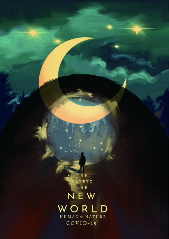 设计说明:设计的理念是通过手绘的水粉感来体现大自然,水粉给人的感觉是随意当中又带着温和,色调冷暖相结合,背景以冷色调为主,隧道则以暖色为主,通过月亮,星辰以及月亮所带的光芒的柠檬黄点缀和高光,使画面亮了起来。字体则与主题相结合,主题是从人与自然的角度考虑。“通往新世界”=“新生”。隧道代表“COVID-19”也代表疫情的过程。