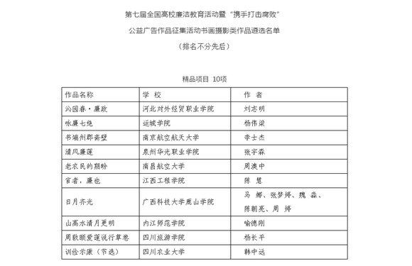 近日,“守初心、知敬畏、扬正气、担使命”——第七届全国高校廉洁教育活动暨“携手打击腐败”公益广告作品征集活动结果在线公示(http://www.moe.gov.cn/s78/A12/A12_gggs/s8473/202002/t20200212_420327.htm),我校辅导员张宇森的作品《清风廉莲》入选书画摄影类十项精品之一。本次活动由教育部思想政治工作司主办,高校思想政治工作创新发展中心(东南大学)承办,面向全日制普通高校在职教职员工和在校学生开展,征集作品分为艺术设计类、网络新媒体类、表演艺术类、书画摄影类4大类。
